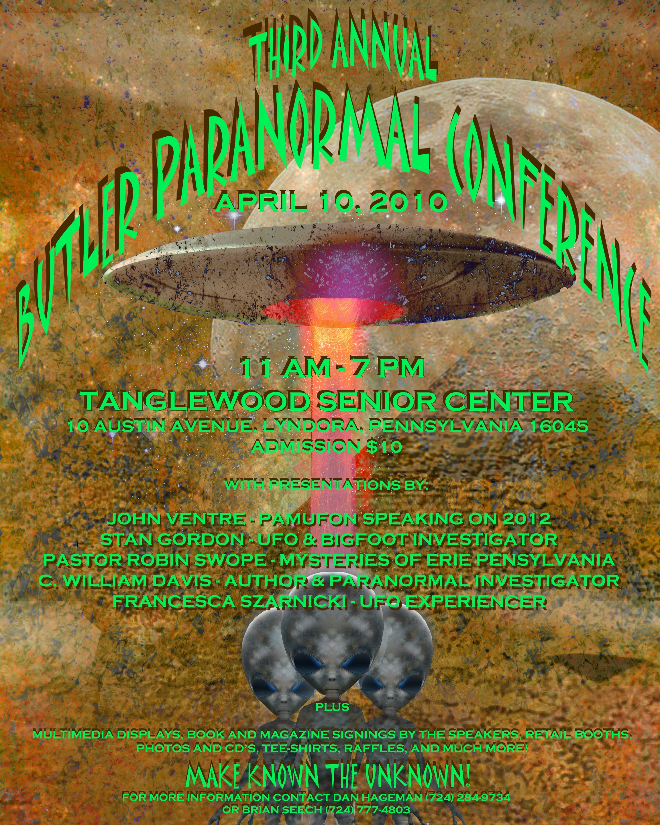 | The Butler Paranormal Conference was held on April 10, 2010 from 11:00am To 7:00pm The Location was The Tanglewood Senior Center at 10 Austin Avenue in Lyndora PA 16045 |